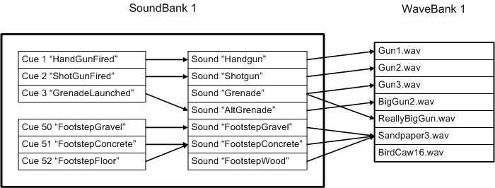 Sound bank不包含wave数据, 只是引用了wave bank中的wave, 并保存怎么播放它们的信息
