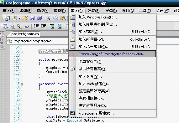 首先必須先設計好一個Window Game的遊戲專案,能夠真正的在Windows 上執行遊戲,之後就可以透過XNA 2.0的功能來轉換成給Xbox 360執行的專案,在專案=>Create Copy 專案名稱 for Xbox 360(如下圖),之後按下確定後就會自動產生出給Xbox360執行的專案,而他們的程式碼是互通的。