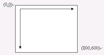 2D的座標系統是依左上為原點,X軸往右增加往左則是減,而Y軸往下為加網上為減,如下圖所示是一個800 * 600大小的視窗。