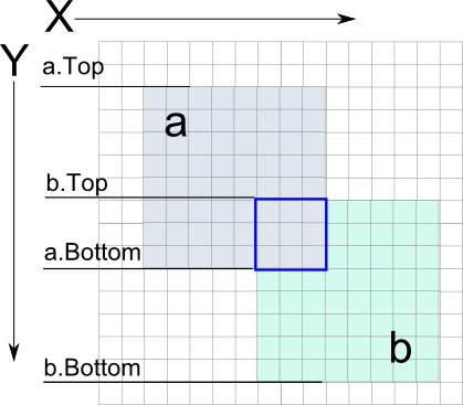 First we need to determine what the bounds of interection are. So we compare the tops and sides of the 2 rectangles. Remember that Y goes the opposite direction then we might think, so the top of a rectangle is a smaller number than the bottom. So we will compare the Top of a and b and see which one has a bigger value, meaning which one is LOWER on the screen. So in this case b’s Top is a bigger number than a’s Top since b’s Top is lower on the screen than a’s (confusing isn’t it). So to find the lowest object Top on the screen we compare and choose the maximum Top between the 2 objects. You should also see that in this image b.Top is the top of our collision area.