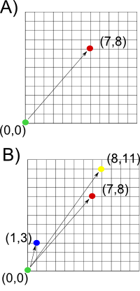 One of the simplest operations we can do to a vector is addition. Say we take our vector [7,8] and add [1,3]. If we look at example B, we see the 2 vectors. But when we add them, we simply add their 2 components. Thus resulting in a new vector [8,11]. Which makes more sense if we look at example C where we have stacked the first