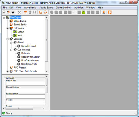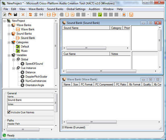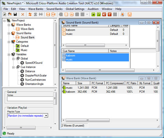 For detailed information about how to author audio in the XACT tool, including information on categories, variables, and other advanced features, see XACT Audio Authoring.