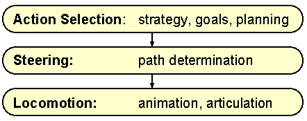 The behavior of an autonomous character can be better understood by dividing it into several layers. These layers are intended only for clarity and specificity in the discussion that will follow. Figure 1 shows a division of motion behavior for autonomous characters into a hierarchy of three layers: action selection, steering, and locomotion. Certainly other dissections are possible. A similar three layer hierarchy is described by Blumberg and Galyean [Blumberg 95], they call the layers: motivation, task, and motor. Note that while the behavioral hierarchy presented here is intended to be widely applicable to motion behaviors, it is not well suited for other types of autonomous actions, for example the conversational behaviors of a “chatterbot” require a significantly different structure.