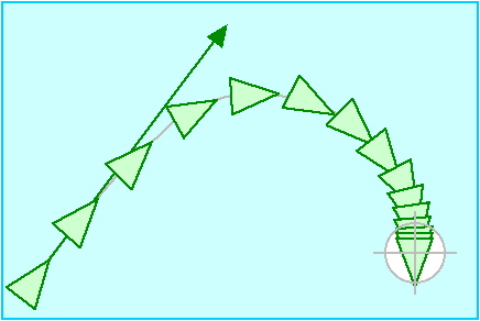 The approach taken in this paper is to consider steering behaviors as essentially independent from the underlying locomotion scheme. A simple locomotion model will be presented in order to make the discussion of steering behaviors more concrete. This locomotion model will be based on a simple idealized vehicle. The choice of the term “vehicle” is inspired to some degree by [Braitenberg 84]. It is intended to encompass a wide range of conveyances, from wheeled devices to horses, from aircraft to submarines, and (while certainly stretching the terminology) to include locomotion by a character’s own legs. The vehicle model described here is so simplistic and generic that it is an equally good (or equally bad) approximation to all of those.